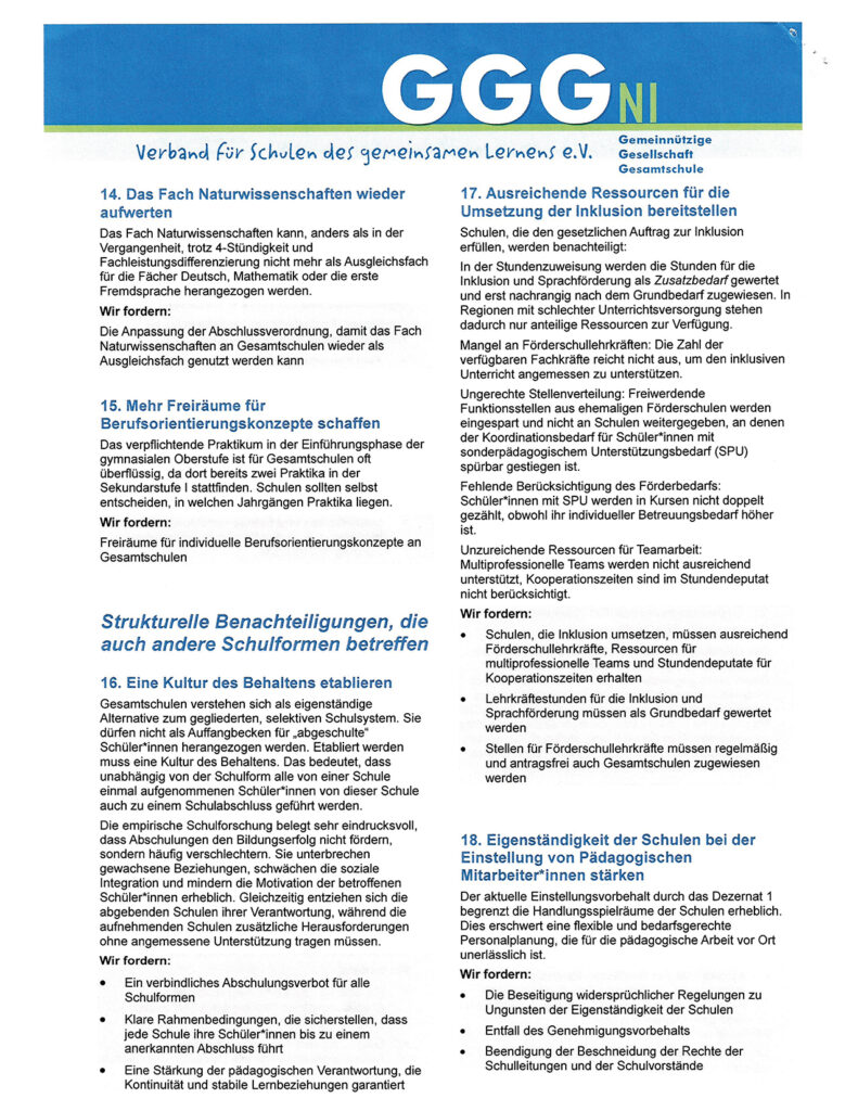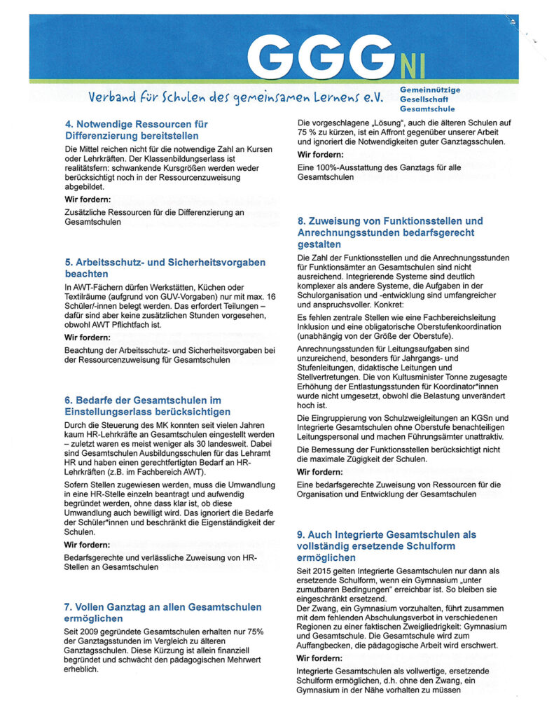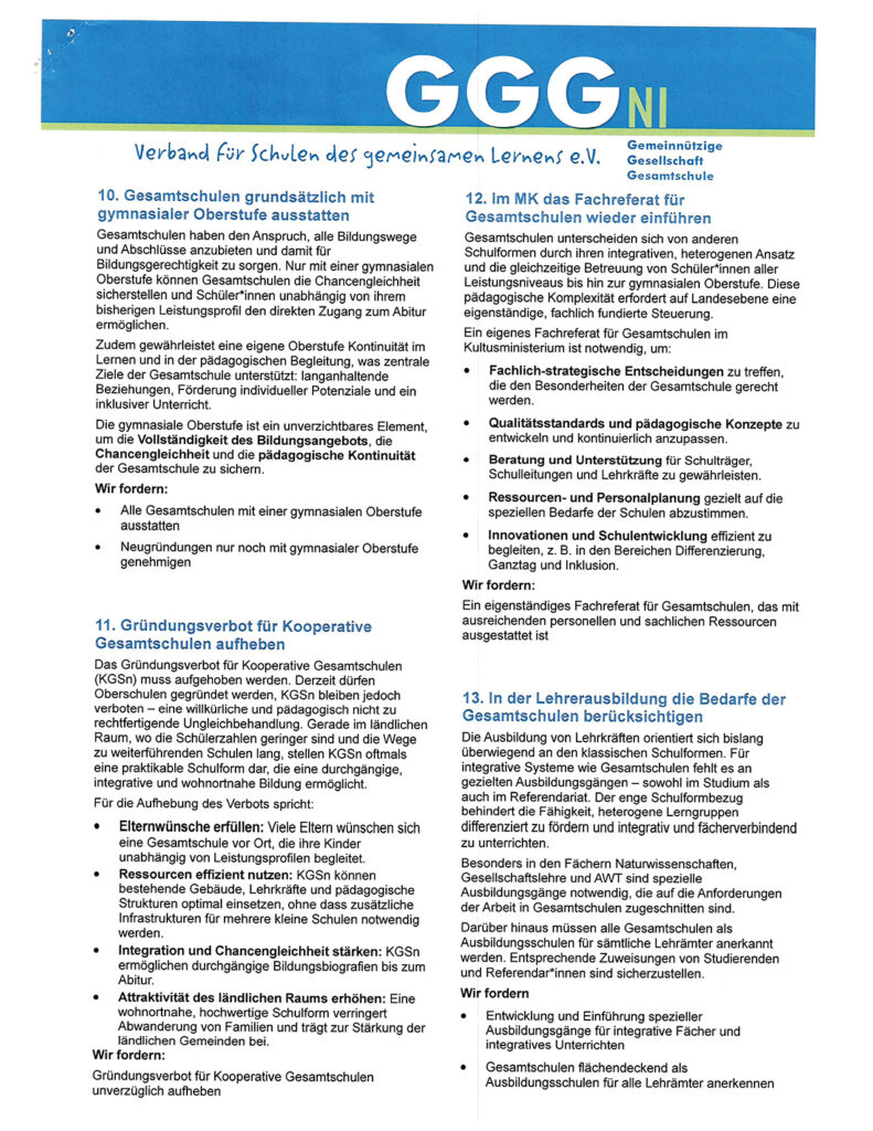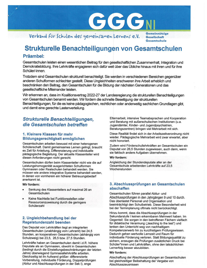 In der Zeit vom 29. 10. -31. 10. 2025 fand die Herbsttagung der Gesamtschulleitungen Niedersachsens in Peine statt. Dabei erhielten wir die Möglichkeit, mit der Ministerin Frau Julia Willie Hamburg ins Gespräch zu kommen. Der Vorstand der GGG (Gemeinnützige Gesellschaft Gesamtschule) übergab der Ministerin einen Forderungskatalog (s. u), der die die strukturellen Benachteiligungen der niedersächsischen Gesamtschule auflistet und Ideen zur ihrer Beseitigung enthält.